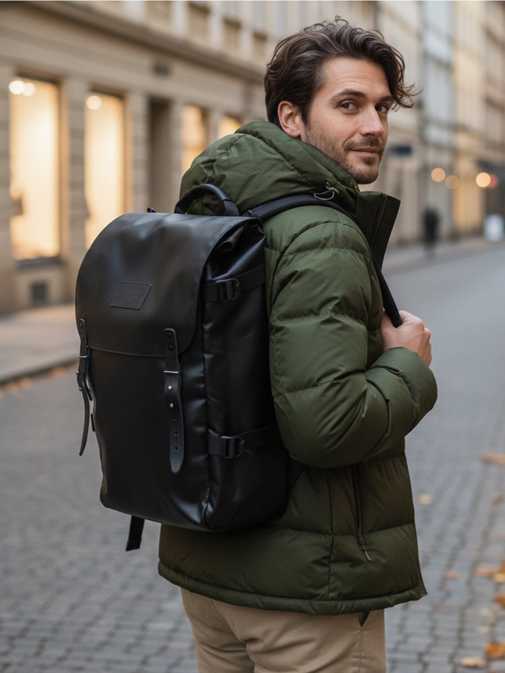 Mestský aj cestovný super batoh. S priestorom na laptop 15,6. Povrchovo jednoduchý, ale vo vnútri plný vreciek. Batoh sa uzatvára pomocou kožených remienkov a kovových sedlárskych gombíkov. Rýchly a bezpečný spôsob uzatvárania zaisťuje bezpečnostná kovová vsuvka.